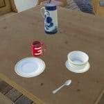 Place the cup in a free space, crouch down as flat as possible in front of the cup, grab it so that it can be picked up optimally and placed elsewhere.
