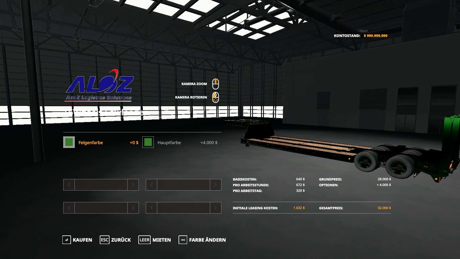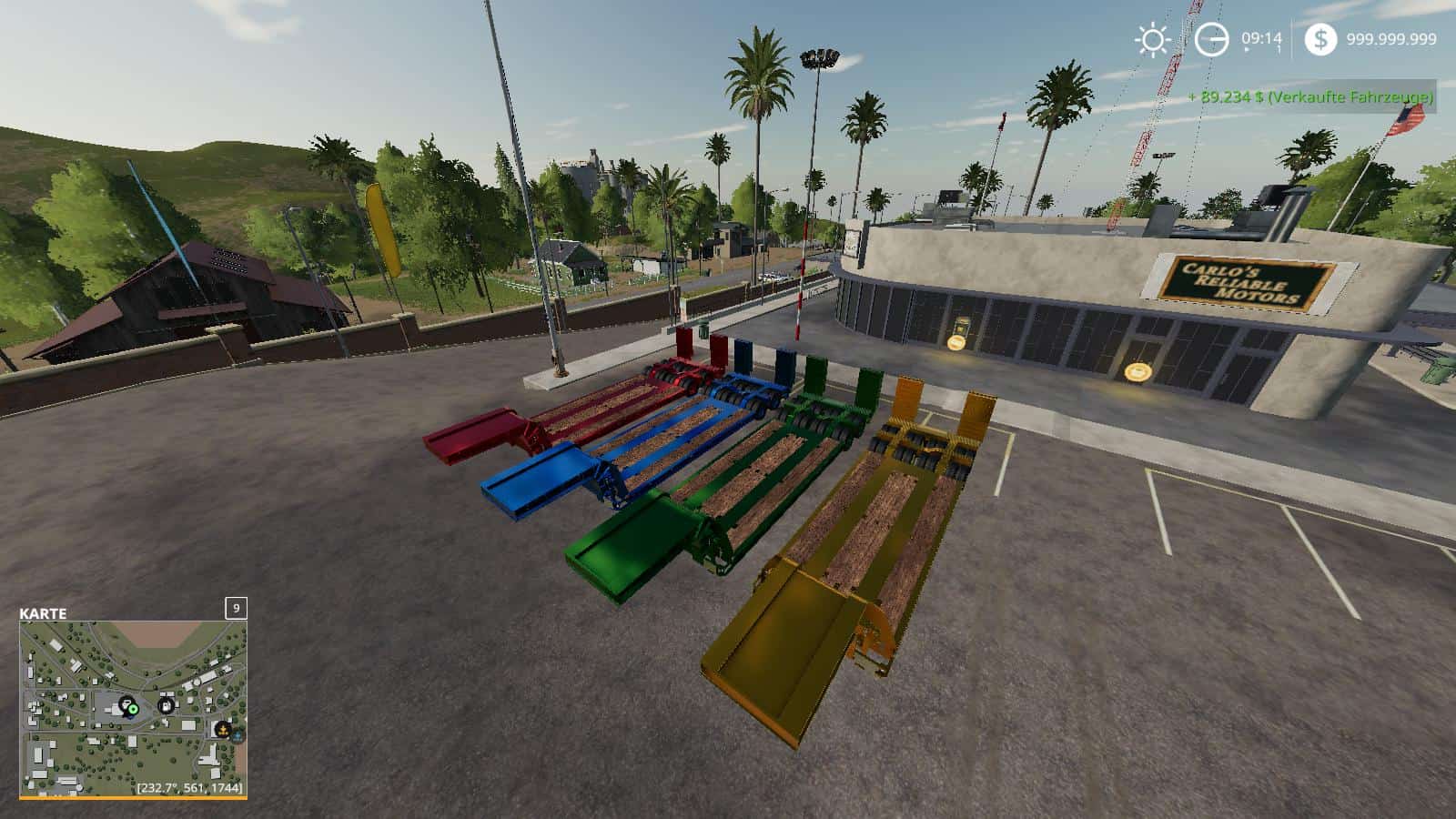 Today i present you the 16wheelsloader lowdecktrailer which is made by erixo5 but i have i have added the candy paint to the lowdecktrailer itself and to the rims.There are 4 different candy colors to choose from as u can see in the photos.you have candy red,blue,yellow,green and those colors are on the top of the color pallet row in the rim and trailer section.credits go to giants as usual.you can unfold the the trailerramps using ur X key and fold them back up again.