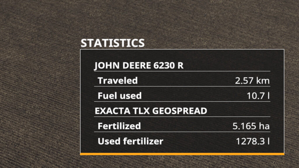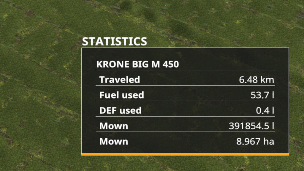 This mod will collect a bunch of individual statistics for your vehicles and tools, you can show them by pressing LALT + T when you are on your seat, press it again to show the partial counter (it can be reset by pressing LCTRL + T).