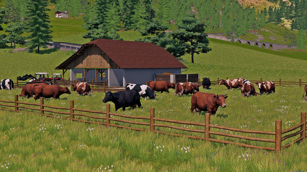 This is a smaller barn suitable for about 30 cows that you can place in the game as a placeable. It has a hose system for pumping slurry, the net on the side can be raised or lowered as desired, the ladder can be moved if it gets in your way and put back when you need it. Dry bales of hay or straw can be stacked on top of the barn to keep them dry until use.