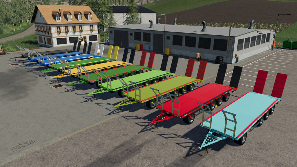 Bale trailers for manual or automatic bale transport supporting different bale sizes and positions. The models are: 2, 3 or 4 axles, different trailer configurations and the colors are customizable. The trailers is ideal for the transport of round bales and square bales, but it is also possible to transport vehicles and objects. With the autoload version the straps are not hooked but the bales remain blocked by the script. To use the straps unload the bales on the trailer and hook the straps. Automatic bale loading supports: round bales from 1.1 meters to 1.80 meters not in stack, round bales from 1.1 to 1.3 meters in stack, normal and large square bales.