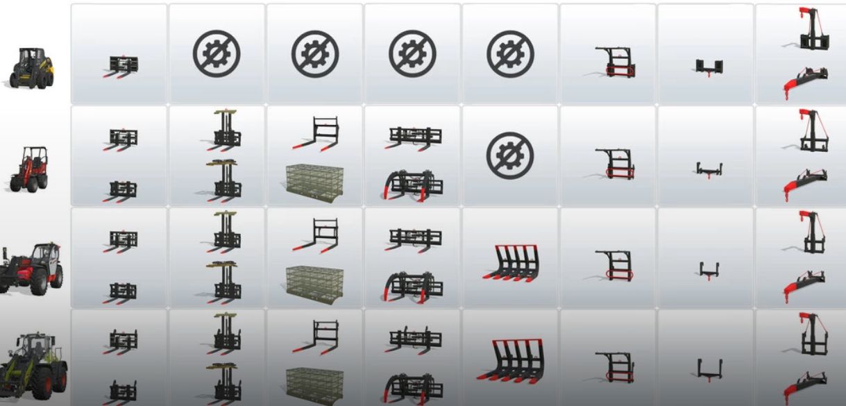 silage bucket, bucket for potatoes and beets, normal bucket, bucket with grapple, raptor bucket, bucket with central exhaust, bale fork, manure fork, fork with grapple, big fork, fork for wrapped bales, biting fork, big bag handler, extension cord, adapters, translator, extra elevation, pallet fork, fork carriage for smart stack cages, pallet fork with grapple, double pallet fork, fork for logs, log shovel, hook for lifting, arm for the lift, extension for lifting, scraper, dozer blade with extension.