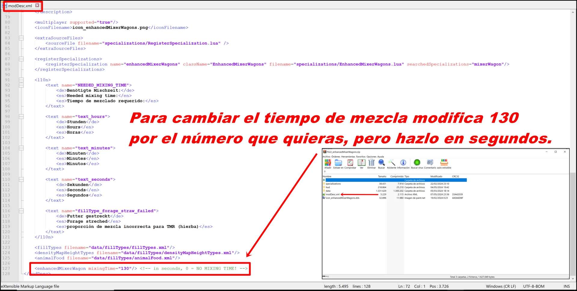 Translation of the FS22_enhancedMixerWagons mod to Spanish ,just unzip the file and drag the content into the mod.