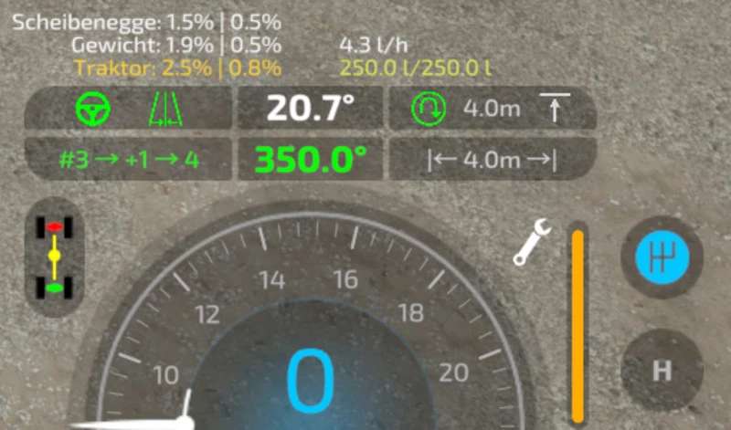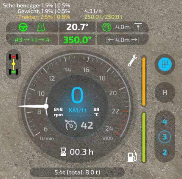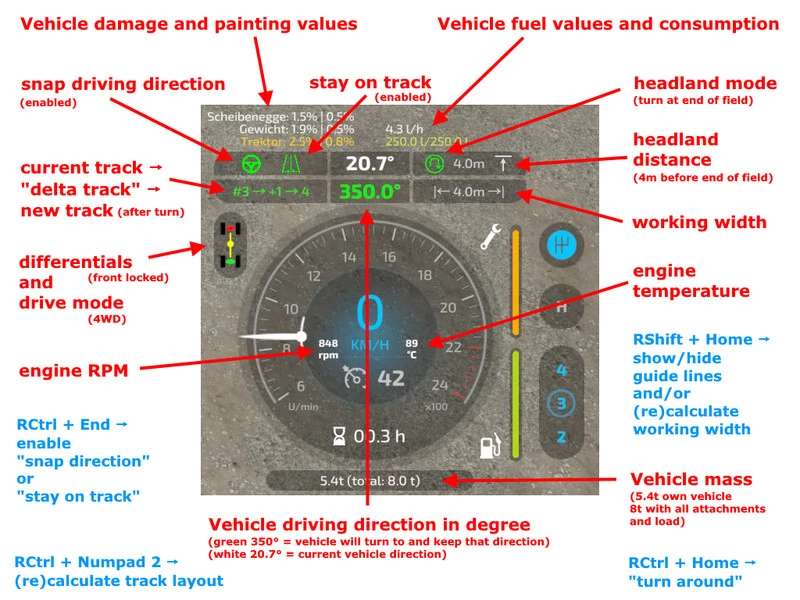 This mod adds a track assistant, a parking brake, differential locks, drive modes (all-wheel, RWD/FWD) and direct control of front/rear hydraulics and equipment to (motorized) vehicles. Additionally, the HUD gets a bit of an upgrade with a more detailed damage indicator, fuel tank level, fuel consumption, engine RPM and temperature, and weight/total weight.