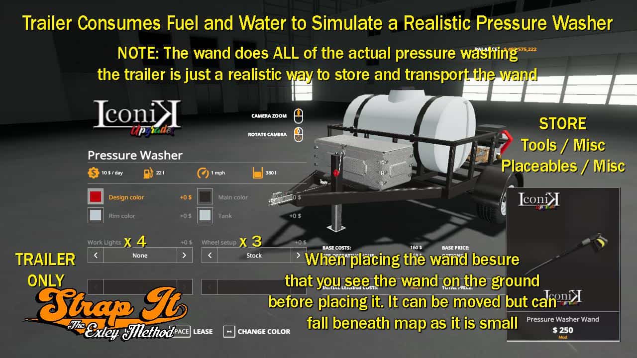 The Wand Does ALL the actual Pressure Washing, the Trailer is cosmetic only! Waiting on the LUA to make a bigger better version that works as it should. Trailer does have sounds, water usage, fuel usage, and animations for a more realistic feel for those who care to use it.