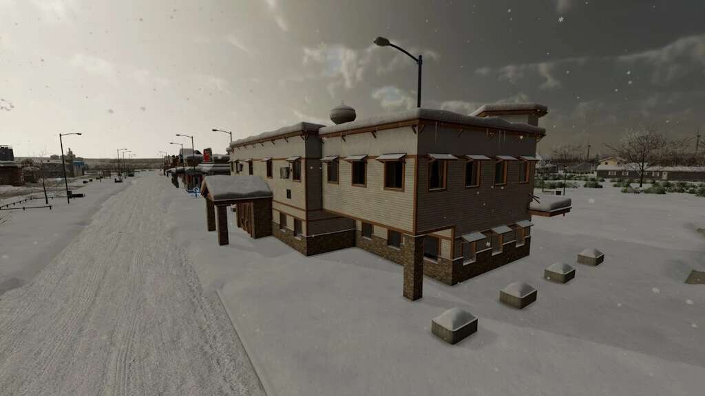 – Snow was added to the roofs of several buildings.