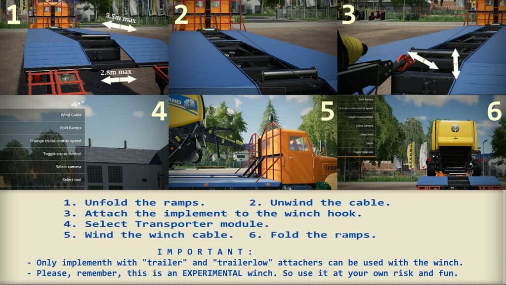 Transport module for transportation of small cars, tractors, agricultural equipment. The module is equipped with an experimental winch (option) for lifting small-sized seeders, cultivators and other agricultural machinery onto the platform (Category: Misc).