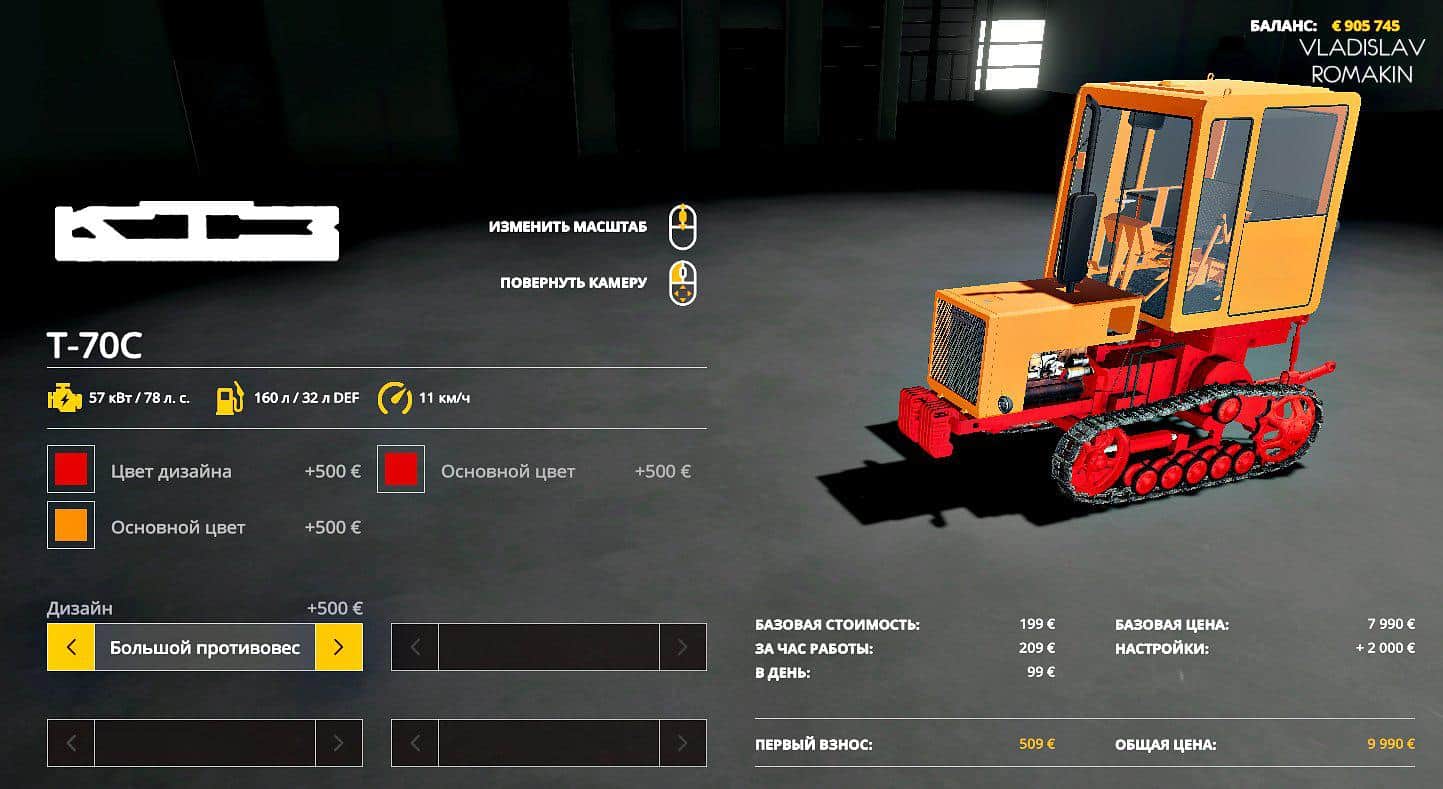 – Engine: D-241L – Power: 57 kW / 78 HP – Fuel tank capacity: 160 liters – Cost: 7990 euros – Choice of body color when buying – Choose the color of the frame when buying – Choice of design when buying – Lighting equipment, instrument panel lighting – Gets dirty and cleans from dirt – Sensors on the dashboard are animated – When it rains, the wipers work.