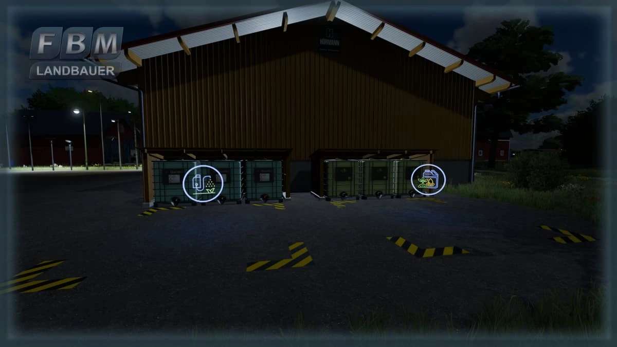 A small wooden hut for liquids. Liquid fertilizer and herbicide tanks with shopping function and tanks as a refillable version. A completely empty hut as a shelter and a fillable diesel tank are also included.