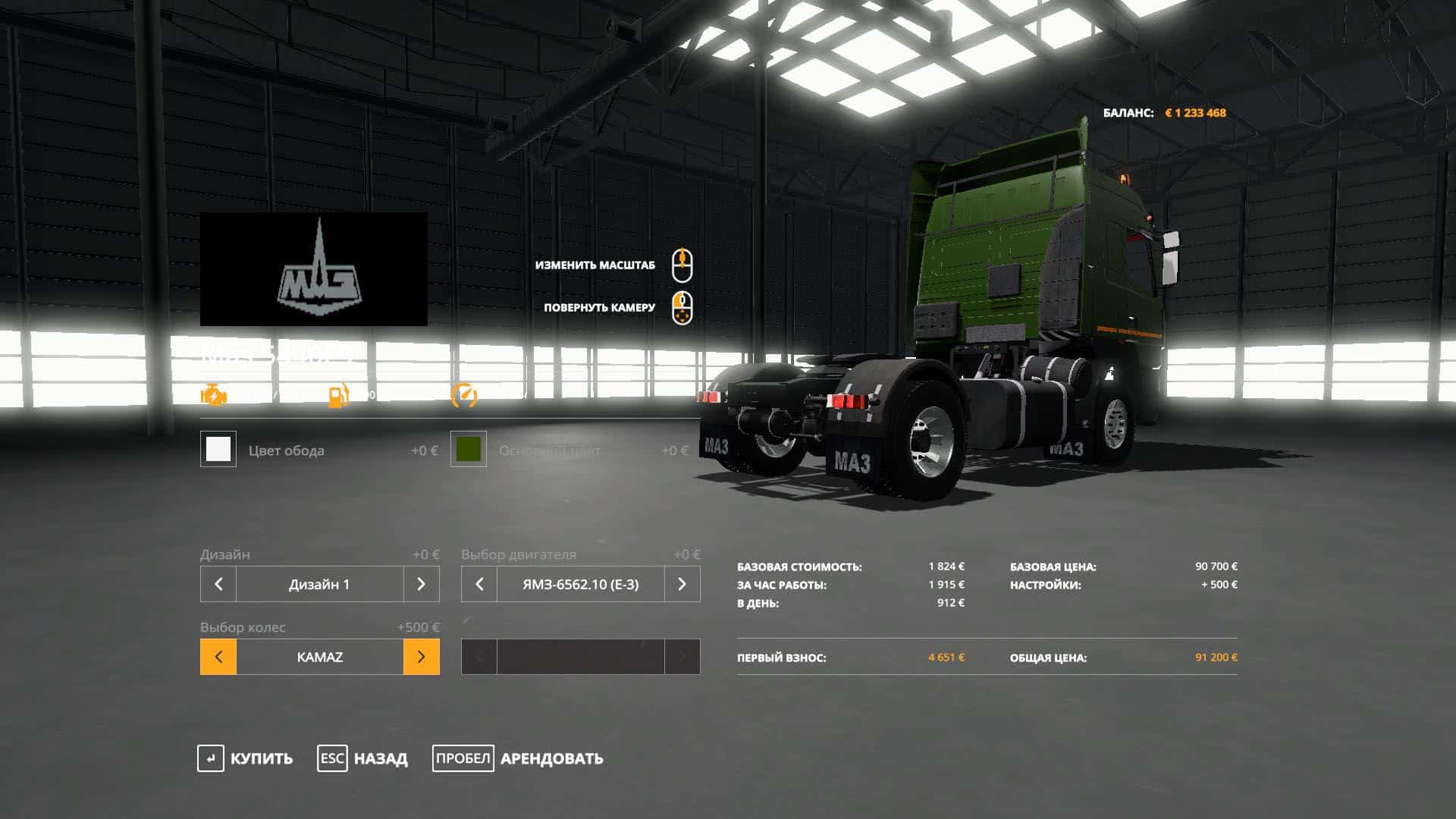 The game has: 4 types of wheels, 3 engines (it does not affect the maximum 100 km / h, but it is felt by traction), a choice of design (you can choose interior decorations), as well as a choice of the main color of the cab and a choice of the color of the discs. In general, I think everyone can customize for themselves …