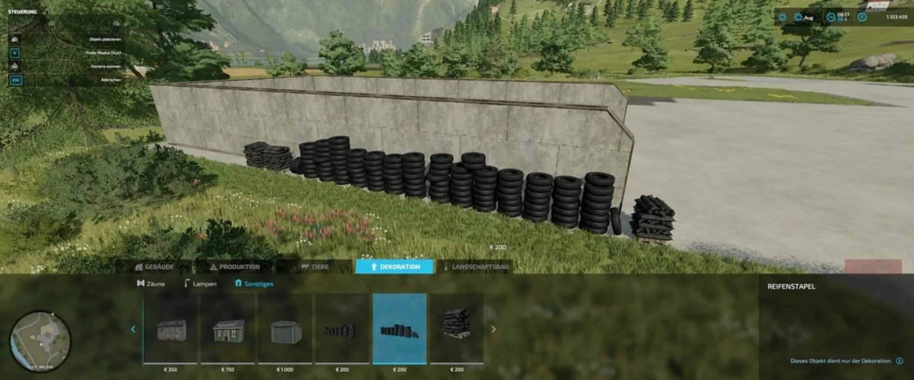 3 placeable decorative objects in a nutshell, 3 placeable decorative objects two stacks of tires and a pallet with foil weights. Pay attention when placing on a level floor, leveling is deactivated ingame can be found under Decoration-Other.