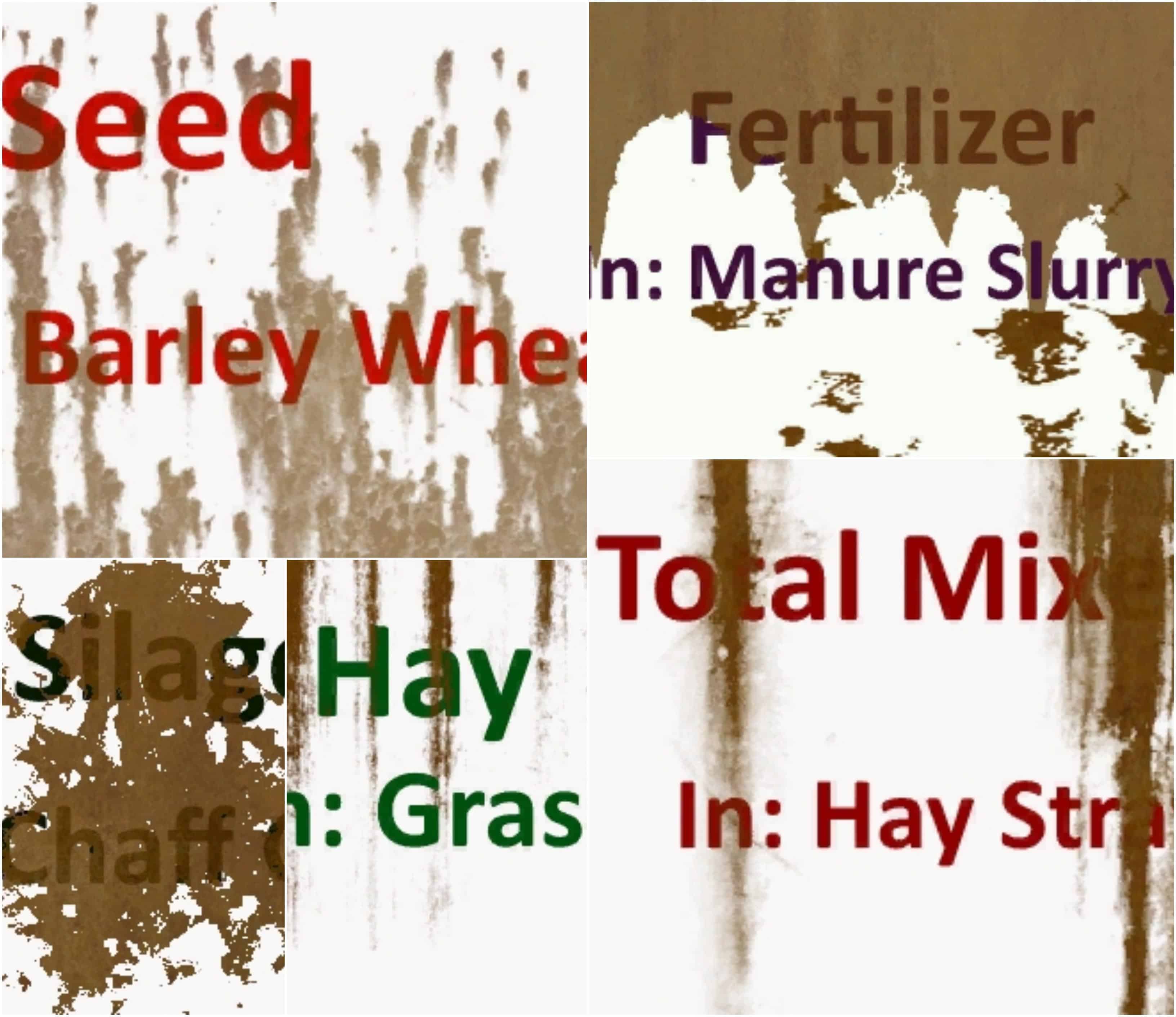 The signs are for the production of Hay, Silage, TMR, Seed, Fertilizer, Pig Food and Pig Food/Diesel.