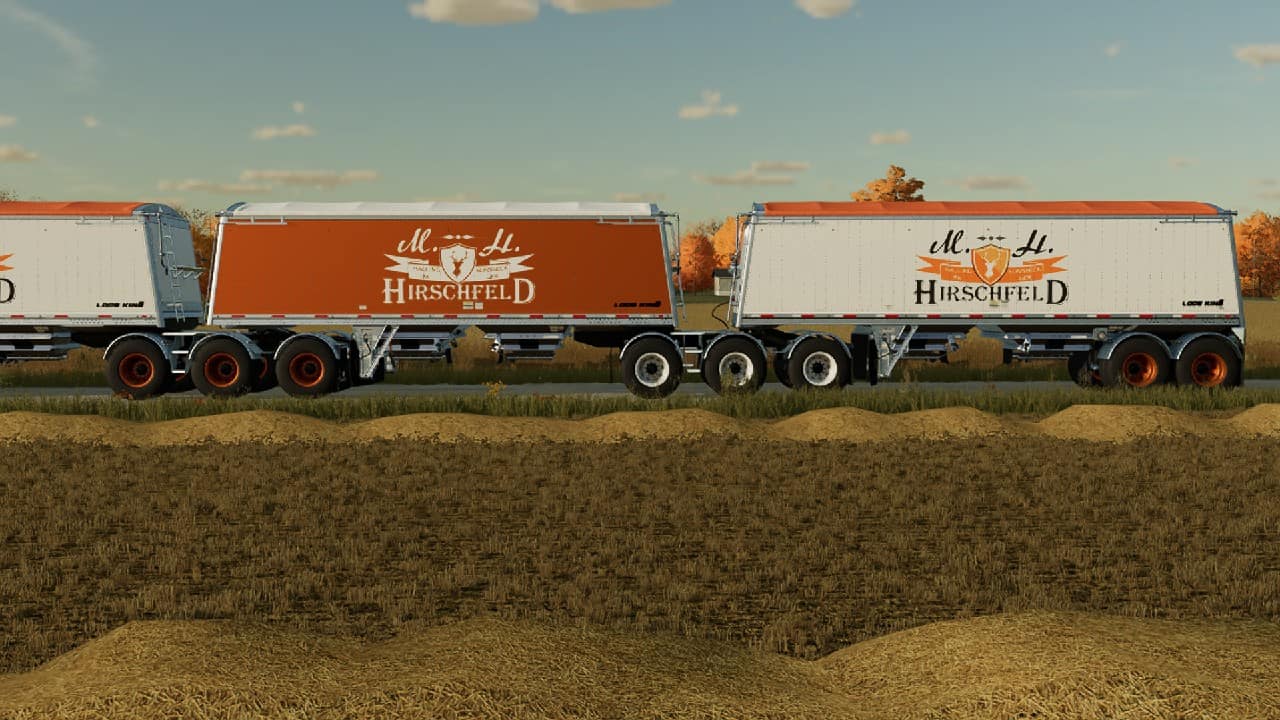 The LS22 Mod by [HIP] Patrick brings the first Hirschfeld Hauling Roadtrain to the Farming Simulator 22. This trailer set is completely available in the shop and can even be extended. The divided granaries give enough opportunities to set off with different content.
