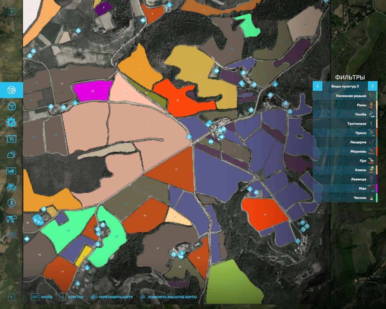Real Google terrain, 11 new fruits, 45 farmlands, 50 fields (0.2-13 ha, including 6 grassfields), 5 forests (more than 11,300 trees), 21 vineyards, 8 olive groves, cosy villa with a pool, 4 lakes with water intake, vehicle shop, workshop, 3 gas stations, cow barn and livestock market, all the animal types, real animal diet, 7 sell/buy points, 19 production points, generators, 2 bunker silos, 6 storages, Central Italy GEO, friendly neighbors and good contracts.