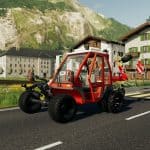 This is a mountain tractor WbM Metrac H6. It can be used for steep terrain. it has a front floating hydraulic and PTO and it can be used to pull small vehicles. It has toogle steering mode.