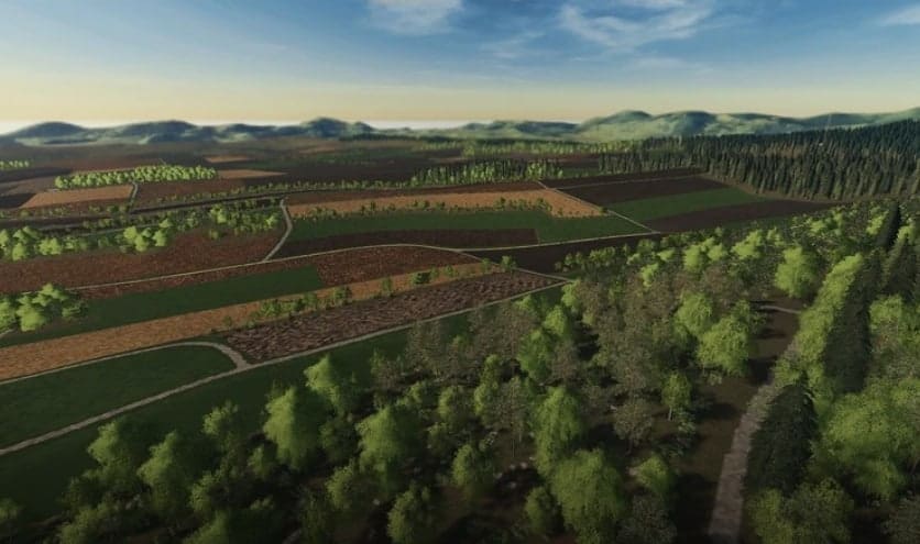 The map is a 1:1 replica regarding terrain and fields, except for the edges. It is a large 4-fold map with 167 fields and 85 meadows. There are 5 different farms: Farm1 and Farm2: cattle ; Farm 3 pigs ; Farm 4 horses ; Farm 5 cattle.